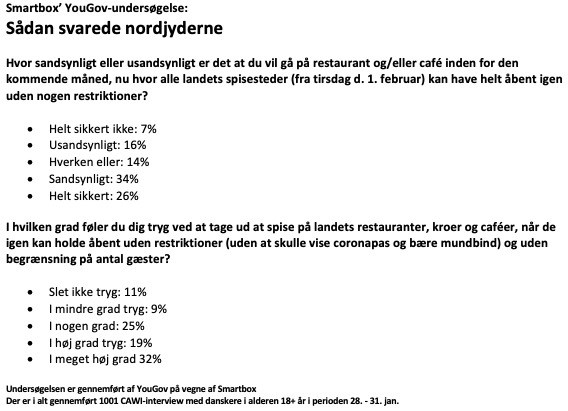 I Smartbox’ YouGov-undersøgelse svarer 20%, at de slet ikke eller i mindre grad ville føle sig trygge ved at skulle ud at spise, mens 51% svarer, at de i høj grad eller meget høj grad føler sig trygge ved at spise ude.