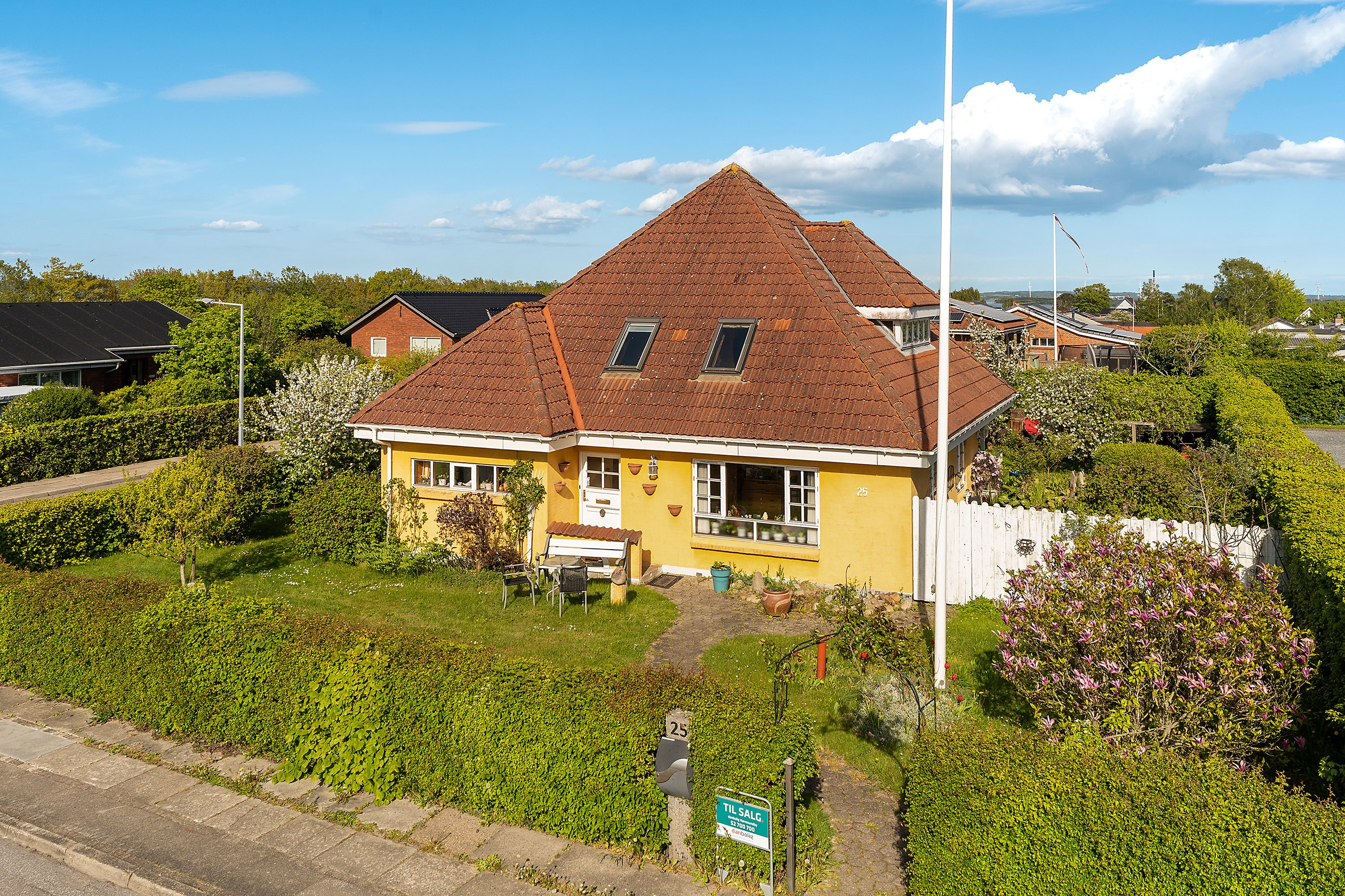 Udefra præsenterer villaen sig særdeles charmerende med solgul facade, hvide sprossevinduer og rødt valmtag. Den dobbelte carport er opført i matchende stil. Den solbeskinnede have er nydeligt anlagt med flere terrasser og varieret beplantning, så der er flere gode hyggekroge at tilbringe sommer og solskinstimer i.